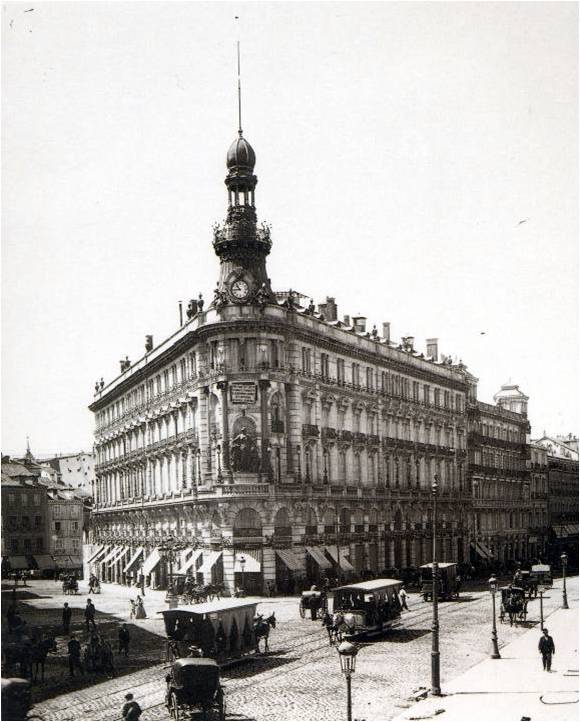 The first agency was in Madrid, Alcala street, which changed its location over the years. First occupied a place in the famous corner building called «La Equitativa» that we have extended an image that opens this blog post in which you can see the signs of our company. The entire building is shown in the image on the right that was taken in 1890, the date on which the agency Madrid/Alcala was already open. As a curious note can be seen that the few vehicles, animal-drawn, passing through the street of Alcala, made it even on the left.